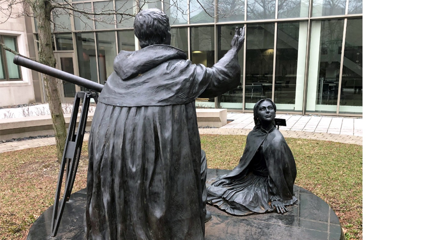 During the campus closure in response to the 2020 Coronavirus outbreak, Jeffrey Carlson, PhD took a moment to reflect on the “Inspiring Minds” sculpture located in Founder’s Court in front of Parmer Hall. The elegant bronze sculpture features three figures and a telescope, Fr. Samuel Mazzuchelli, a Sinsinawa Dominican sister, and a student.