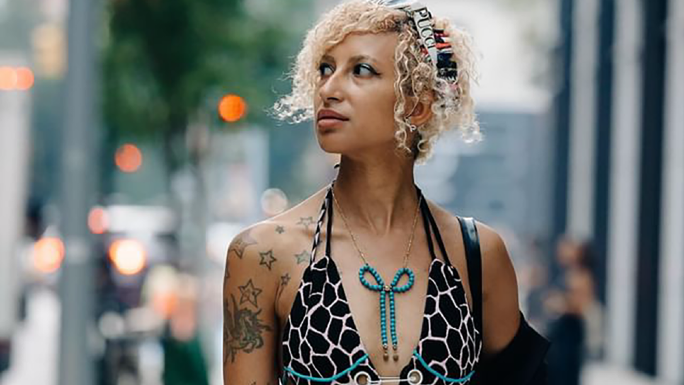 The model wearing the metallic blue one-piece was Leyna Bloom, who first appeared 16 years earlier in the Dominican fashion show Turner helped cast.