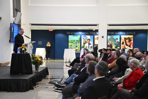 An audience of about 120 attendees, consisting of invited students, staff, faculty, university board members, Sinsinawa Dominican Sisters and university supporters, gathered Oct. 13 in Parmer Hall for the address.