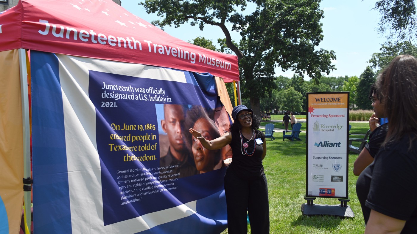 The Juneteenth Traveling Museum, sponsored by the West Communities Juneteenth Collaborative, was also available to view on the Quad. One of the featured historical stories was that of Nance Legins-Costley, a young woman born into indentured servitude in Illinois who fought for her freedom before the Illinois Supreme Court in 1841.