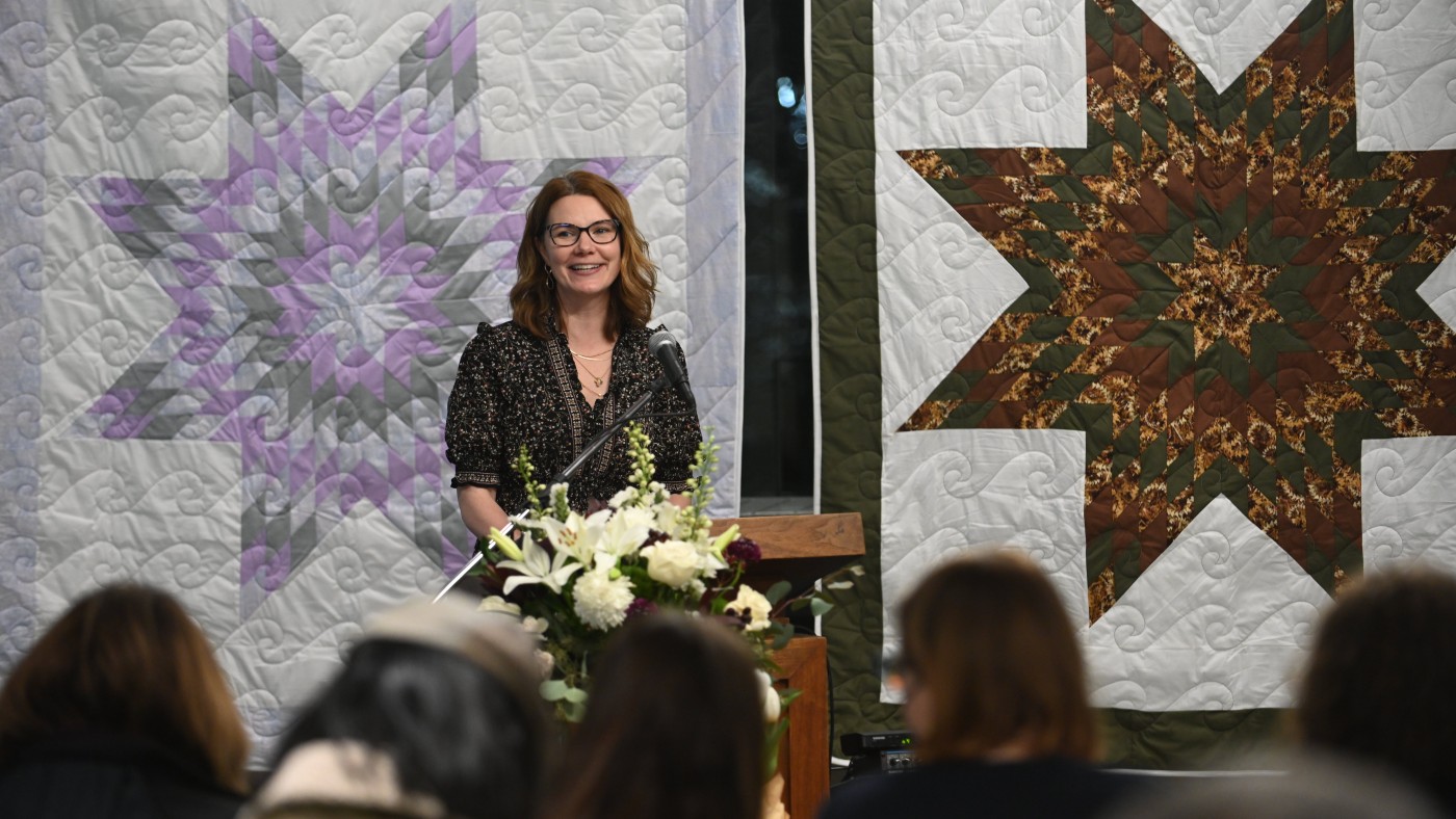 With Lakota star quilts as a backdrop, guest speaker Megan Red Shirt-Shaw, of the Oglala Lakota Nation, addressed the importance of Indigenous land acknowledgment by institutions of higher learning that were developed on land from which Native people were displaced.