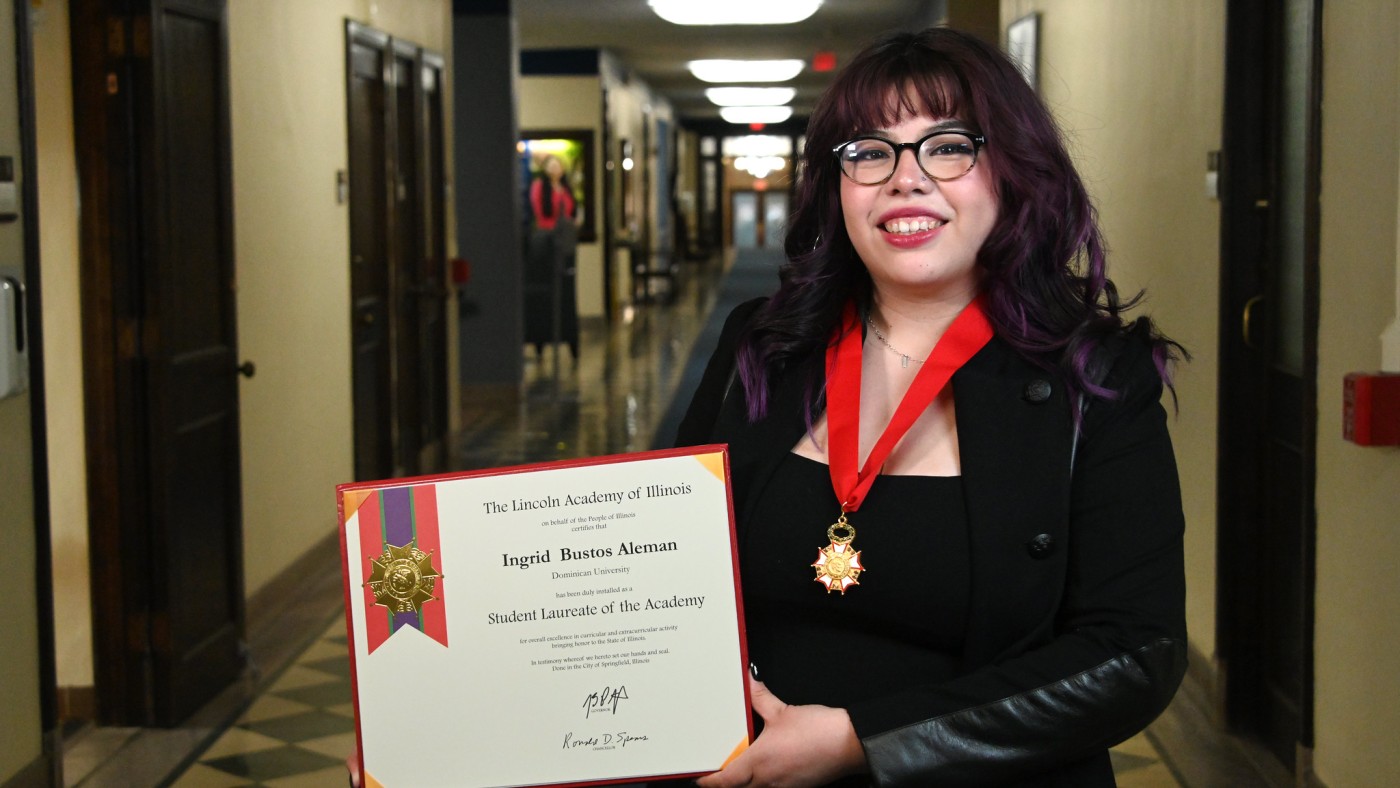 Dominican University senior Ingrid Bustos Aleman was honored as a 2024 Student Laureate by the Lincoln Academy of Illinois during a ceremony held Oct. 26 in Springfield.