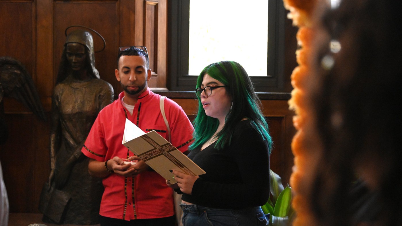 “Our ancestors are with us on our journey,” read student Emily Reynoso Muñoz as the blessing of the ofrenda in the Parmer Hall Atrium began. Mercado encouraged the crowd gathered to “think about the many ways our world is in need of healing.”