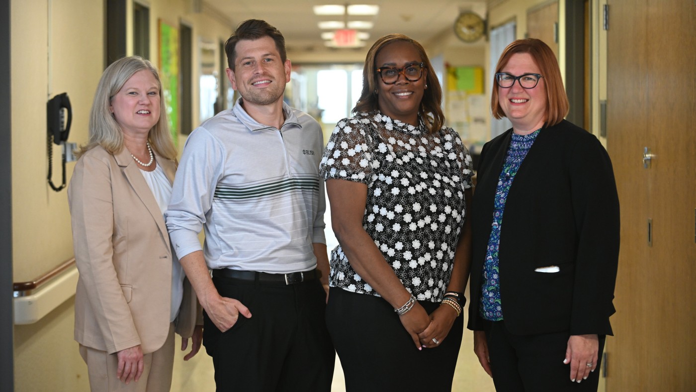 From left to right: Jennie Nuno, director of Patient Care Services and Nursing Practice, Rush Oak Park Hospital; Will Jones, 6W unit manager, Rush Oak Park Hospital; Dr. Tamara Bland, dean, Borra College of Health Sciences, Dominican University; and Angela Cooper, chief nursing officer, Rush Oak Park Hospital.